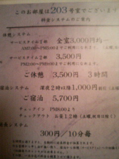 ■時間:フレックスタイムなので多分6時間位居たと思います!!料金は部屋のNOを覚えてないので(紙を無くしました(泣))確認取れ次第ここに書いておきます