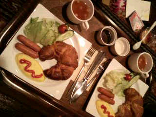 これは驚きの価格で200円!!泊まった方だけが受けられるサ―ビスです!!しかもチョコレートをクロワッサンに掛けて食べるんですがかなりの絶品!!私はウィンナ―に間違えてチョコレート掛けてしまったんですが(笑)